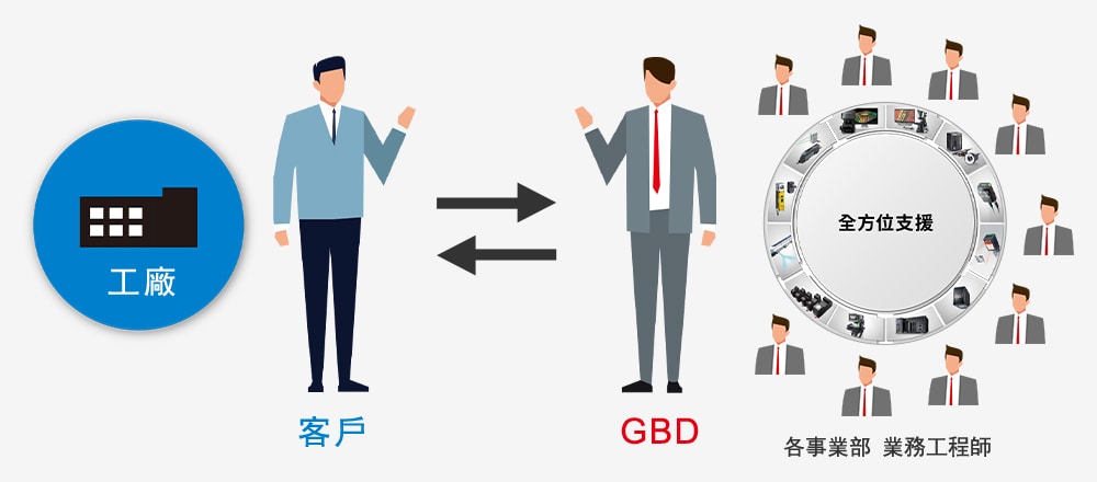 GBD是貴公司的統一溝通窗口協調基恩士各事業部的業務工程師憑藉新穎的技術和產品提出合適的生產方案