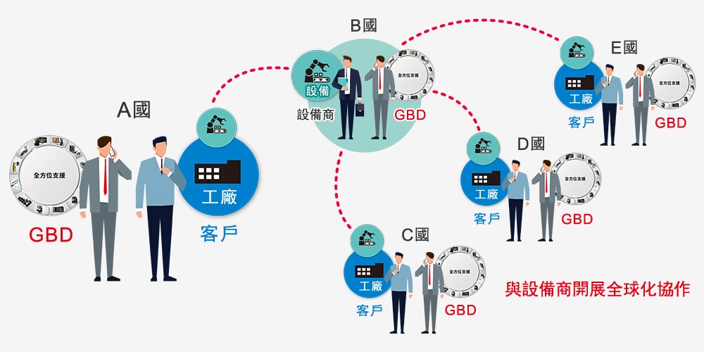 A國工程師選型,B國工廠使用?同樣的解決方案要應用到各國工廠?沒問題!GBD作為窗口,通過基恩士遍佈世界的“直銷”網路,為您提供全方位支援。