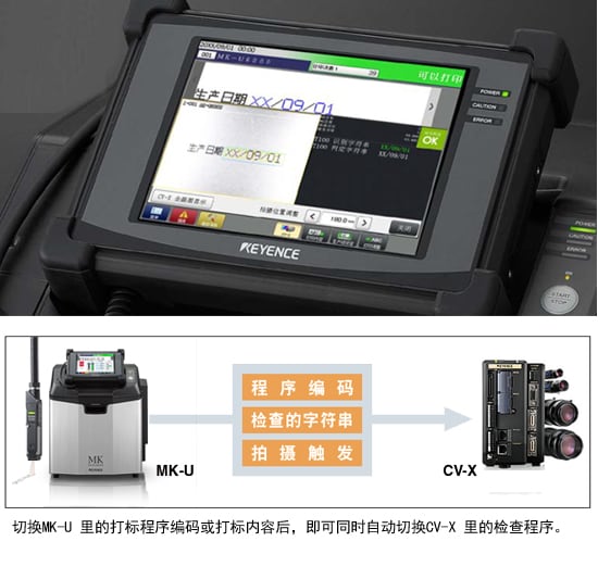 仅需连接LAN 缆线,即可轻松链接MK-U 和CV-X,也无需 PLC 等外部机器。MK-U 搭载打标程序和 CV-X 检查程序的联动功能,仅需操作 MK-U 的面板,即可同步进行打标和检查。还预先配备了OCR 字库,无需耗费大量时间进行设定。