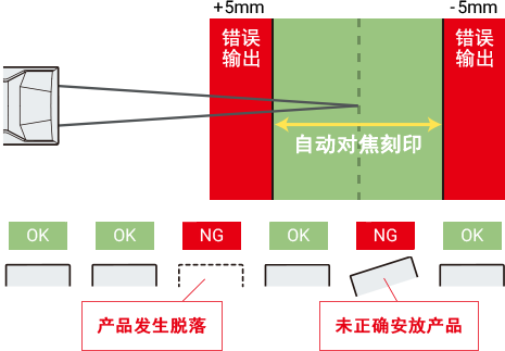 通过配备三轴控制与内置相机,实现了无需借助外部设备的自动对焦刻印。即使目标物的高度发生变化,也能跟随变化,维持刻印品质。一旦结果超出预设的阈值,还能进行错误输出。通过掌握产品的脱落及浮起情况,不仅能够避免刻印不良,还能预防其他各类后续工序问题。