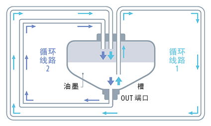 MK-U 采用了全新适用于颜料油墨的槽构造。 通过双重循环系统成功抑制了发生在运转中的沉淀。 由于高再分散性的油墨和双重循环系统可防止油墨 线路的堵塞,故作为颜料油墨,可实现与染料类油 墨同水准的稳定运行。