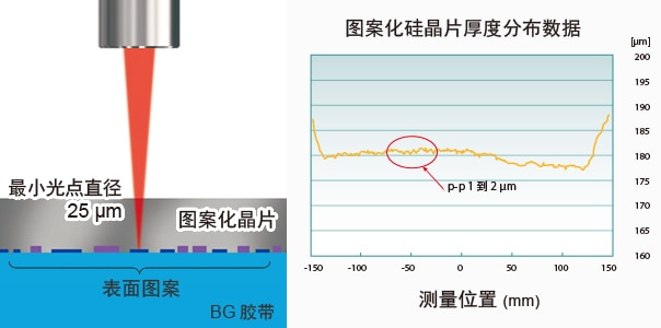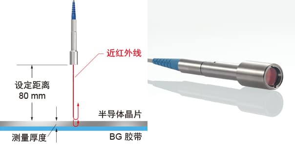 SI-F80R 系列使用近红外 SLD,可穿过硅、砷化镓、碳化硅、磷化铟、非晶硅及其它半导体。即使晶片已封上 BG(背磨)胶带,也可精确测出晶片厚度。