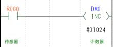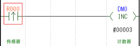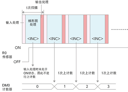 在执行程序时传感器R0为ON期间, 将会执行每次扫描INC命令,并进行上计数。