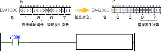 DM1000的高位字节、低位字节中存储有"断线地址编号"和"错误发生次数"。 仅抽出"错误发生次数"的数据,存储至DM2000。 请从解答1至解答3中,选择要填入以下空栏中的适当梯形图程序。