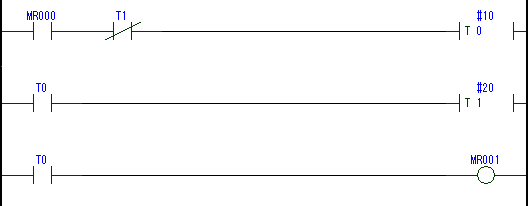 KV-5500/5000/3000可通过1指令语言执行闪烁回路。 下述程序中,MR0置于ON时,MR1将重复进行2秒ON、1秒OFF。