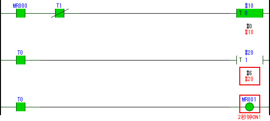 (3) 经过2秒后,计时器1(T1)置于ON,且计时器0(T0)置于OFF。 计时器0(T0)置于OFF的同时,MR1也将置于OFF。