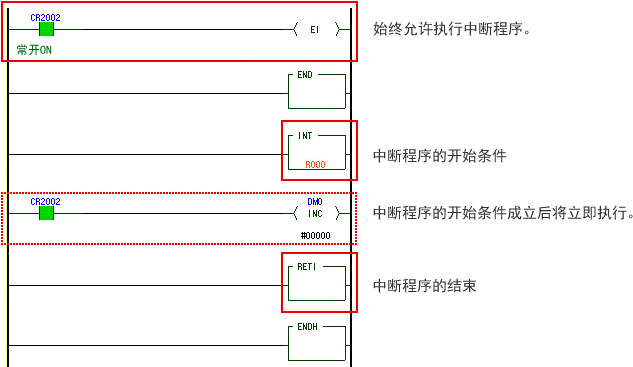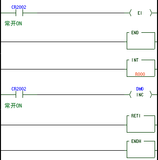 中断程序的开始条件(R000)置于ON后,将开始中断程序,并加算DM0。 本问题的重点在于执行中断程序的时间。 中断程序仅在启动开始条件(R000置于ON)时执行,因此DM0加"1"。