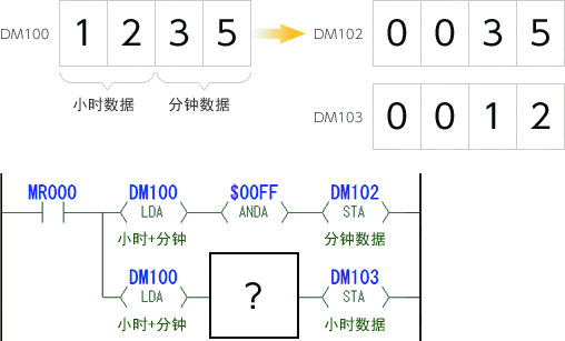 将从上位PLC发送时间信息。发送来的信息将在1个字寄存器中,以高位字节的小时数据(BCD)格式、 低位字节的分钟数据(BCD)格式进行存储。按2个字寄存器分别进行存储,可轻松处理时间。 此时,请从解答1至解答3中,选择作为梯形图程序的适当梯形图。