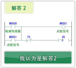 具有检测工件后在一定期间内阀门输出置于ON,并涂抹溶剂的装置。请从解答1至解答3中, 选择适当的梯形图,作为传感器置于ON后处于ON状态,经过0.5秒后置于OFF的程序。