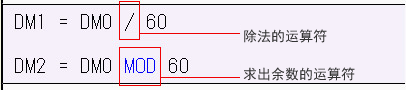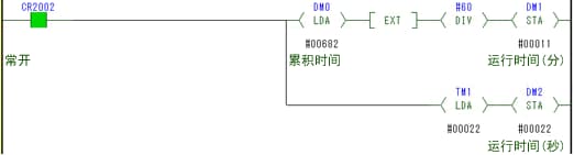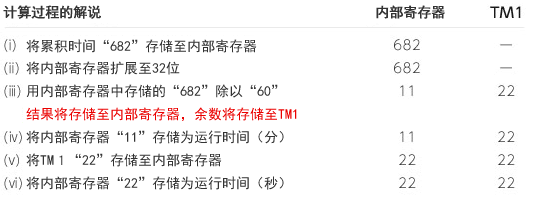 执行上述梯形图程序后,会将除法的商存储为运行时间(分),余数存储为运行时间(秒)。