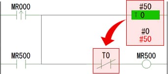 (2) 计时器(T0)动作中MR500具有自我保持功能,因此MR500将持续置于ON。