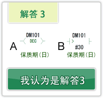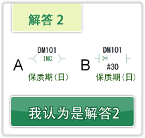 为计算保质期,创建了以下梯形图。如果将MR000置于ON,则可从当前日期时间开始计算出20小时后的日期时间。请 根据以下梯形图程序,从解答1至解答4中选择适合填入"A"、"B"的内容。但本月最多设为30日,并非12月。