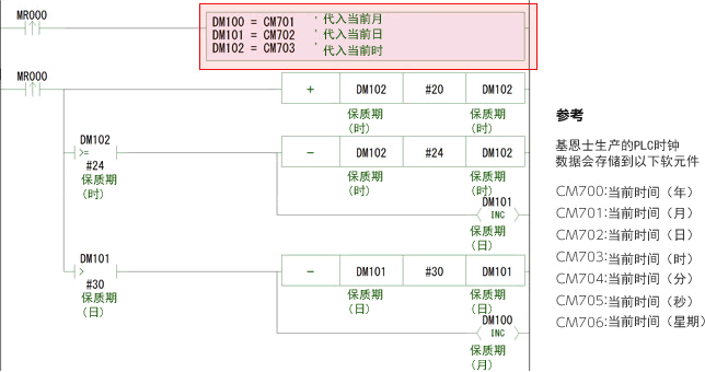 (1) MR000为ON,首先将当前的月日时读取为DM100至DM102。