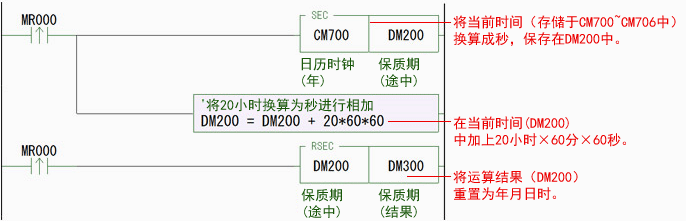 如上述示例所示,如果为12月或并非30日的月、保质期混合日和时等情况,则根据条件计算会更加困难。通 过在KV-5500/5000/3000、KV Nano系列中使用SEC、RSEC指令,只要将保质期的运算等都换算为秒, 即可进行轻松计算。