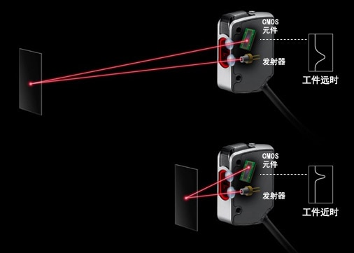 采用应用三角测距的方式,且接收器中配置由多个光接收元件所构成的CMOS图像传感器。通过改变与工件的距离来变更CMOS图像传感器上的接收光波形峰值位置,由此算出到工件的距离。