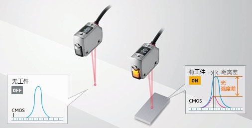 存储到基准背景的距离和光强度,工件在进入检测区域时,如果距离或光强度从存储的状态开始发生变化,则会进行检测。如果存在背景,即使形状复杂、工件的颜色或表面状态发生变化仍可进行准确检测,即使是段差较小的薄型工件也可进行稳定检测。