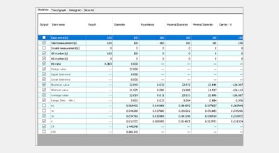 自动计算并显示所选测量项目的OK数、NG数、最大值、最小值、平均值、σ、3σ、6σ、Cpk 等主要的统计值。