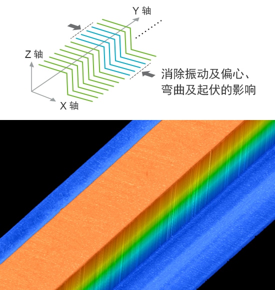 生成3D图像时,分别用 X・Z・θ 补偿2D轮廓的位置。消除振动、偏心、工件弯曲及起伏等影响,生成适于检测的图像。