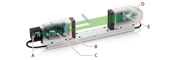 绿色LED光以均匀的准直光束发射。当目标物体遮断该光束时,会在受光元件上形成阴影,测量该阴影即可准确反映目标物体的尺寸。