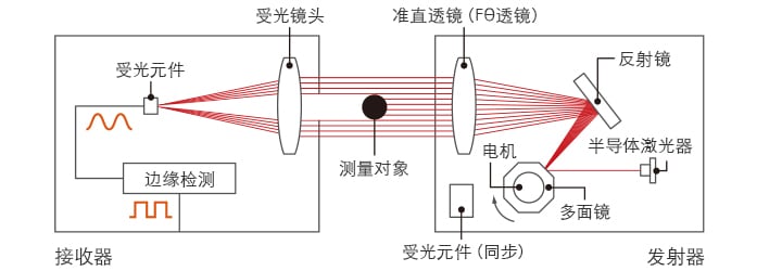 激光照射到旋转的多面体反射镜上,光束以固定速度在传感器的测量范围内扫描。通过测量光被接收器遮挡的时间来确定外径等参数。