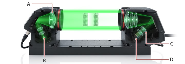 发射器通过绿色LED发出准直光,在接收器的CMOS传感器上投射出阴影。测量通过捕捉到的图像进行。TM-X5000 系列在发射器和接收器中都配备了远心镜头,助力实现稳定且高精度的测量。