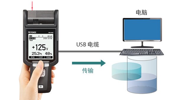 在主体的内部缓冲存储器中最多可记录100个测量数据。可使用USB数据线将记录的数据传输至电脑,然后保存为CSV数据。