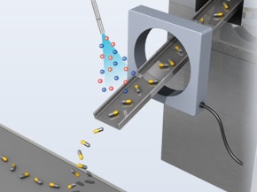 小型除电头却可对外径达600 mm x 1500 mm的大范围进行静电消除。1秒以内即可对前方1 m以上范围进行静电消除。通过分支同时实现装置内部的静电消除。