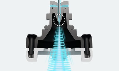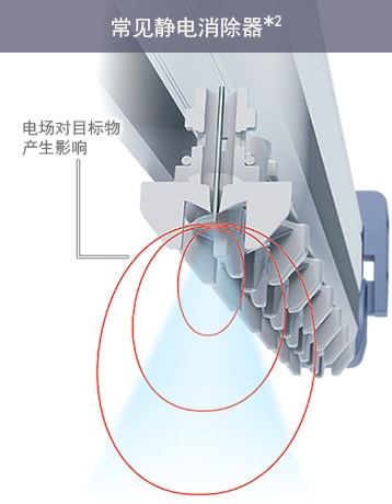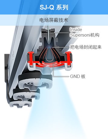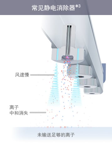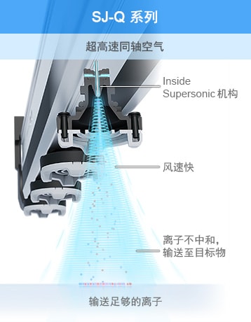 不具备Inside Supersonic结构的离子棒,电极针没有得到保护,放电时就会附着微小颗粒物,电极针需要每隔数周至数月清洁一次。SJ-Q 系列在喷射时,用Supersonic空气同轴包裹住电极针,因此不会吸引来自外部空气的脏污。