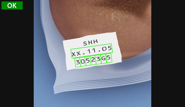 确认生产日期、保质期、批号的刻印。即使包装袋倾斜或褶皱也能确认刻印有无或读取字符内容。