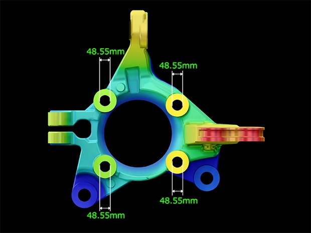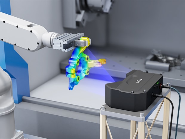 使用机械手将加工后的工件搬出,直接将其置于LJ-S8000的检测区域即可进行三维尺寸检测。使用经过校正的3D数据进行检测能更好的把控工件品质。