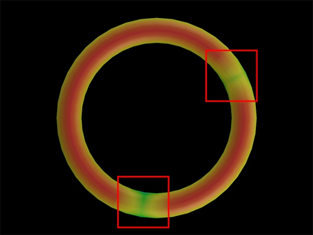 2D相机难以稳定检测颜色差异不明显的O形环。采用可获取3D数据的LJ-S8000,通过高度差异而非颜色进行判定,可预防不良品流出。