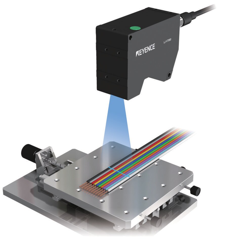 使用 2D 位移传感器测量带状电缆的截面形状和宽度。可不受目标物材质的影响,进行稳定测量。测量导线部排列状态是否正确、宽度是否合适等。