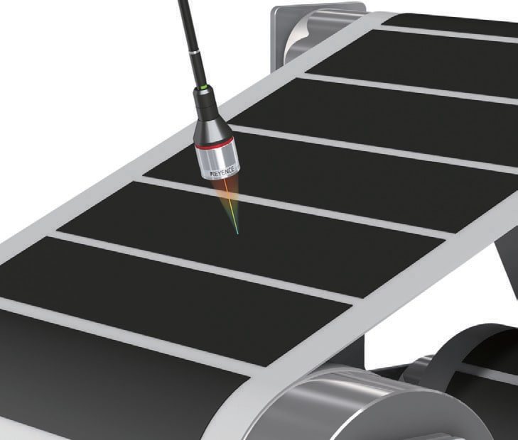 测量间歇涂胶中涂敷的电极端部形状。使用一维激光位移计的CL 系列测量形状。因为共焦原理下的角度特性良好,可以正确检测湿润状态的电极端部的形状。