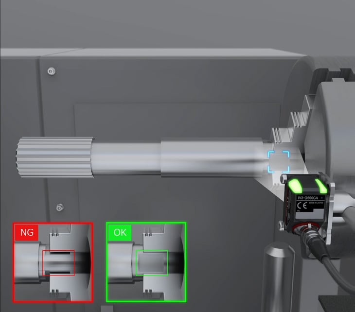 若对压入轴时的相位进行了规定,则需确认。使用视觉传感器确认相位,当有错误时就会使轴转动。如果是自动设备,必须将传感器放入压入机中,因此体积小很重要。人工对半自动设备设置时,需要以远距离设置传感器。