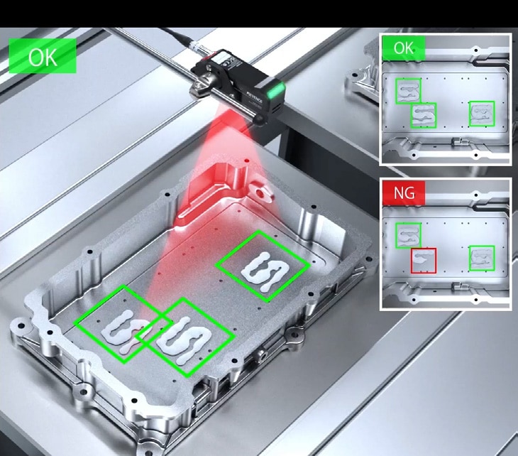 在变频器盒上涂抹用于散热的油脂。由于会因分液器堵塞等无法充分涂抹导热膏而造成不良,因此需要进行管理。导热膏的有无检测大多不存在问题。但若使用 IX 系列,与目标物的表面状态无关,均能稳定检测。