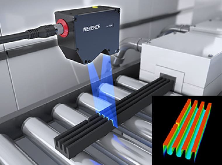 从传感头发出线状激光照射,通过反射光瞬间(超高速64,000次拍摄 / 秒)获取截面形状,根据截面形状数据高精度测量厚度·宽度·角度·截面面积。被运用于高速成型的工件的形状合格检测。