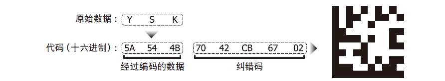 如需将“YSK”转换为 Data Matrix 码:对 YSK 进行编码,按下面的方法计算纠错码,并将纠错码排成正方形。