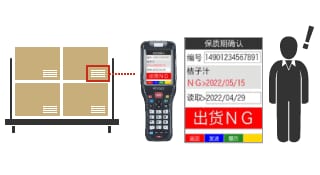 在产品出库时用条形码读码器读取保质期,可以消除目视检查时可能会发生的确认遗漏、识别错误等问题。分别预设各类产品及不同收货方的发货NG日期,就能在条形码读码器读取数据的瞬间完成对比,大幅减少发货错误。在目视检查中,为了提高检查精度,有时必须进行双重甚至三重检查,使用条形码读码器则不再需要这种重复检查。