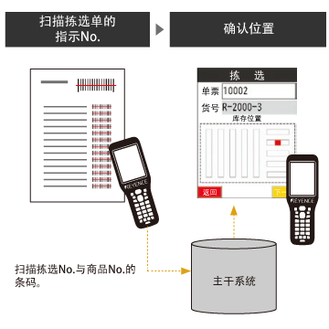 在拣选的过程中扫描产品的条码,核对拣选清单,就能当场完成OK/NG判断。在传统的拣选作业中,必须在发货前读取条码,进行最终确认,而导入条形码读码器之后,就能在拣选的同时完成检品。
