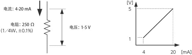 - A:只要小于输出设备的最大负载电阻即可,无需使用250 Ω。例如使用100 Ω时,4-20 mA电流输出将转换为0.4-2 V电压,因此只需对0.4-2 V进行比率补正即可转换成实测值。