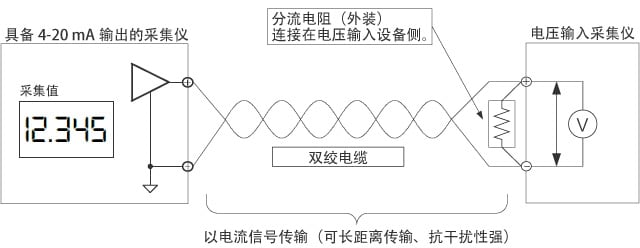 分流电阻连接在电压输入设备侧。用于在设备间传输电流信号。以电流信号(4-20 mA)传输更有利于发挥优势(可长距离传输、抗干扰性强)。(在4-20 mA输出设备侧连接分流电阻时将变成电压传输。)并且,设备间的连接电缆应使用双绞电缆。