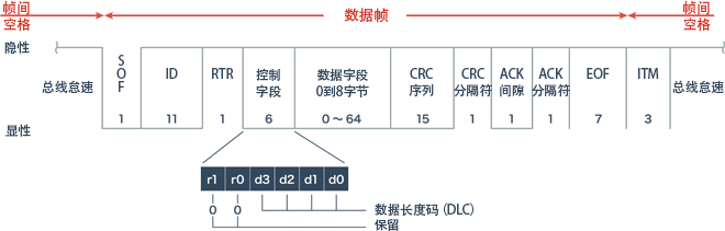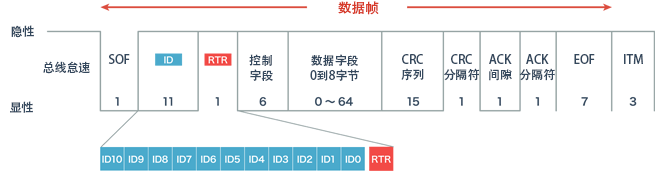 在数据帧中,位于“SOF”之后的ID被称为“仲裁ID”。数据帧ID在标准格式时为11位,扩展格式时为11位+18位共计29位。利用这个ID来识别信息,决定优先顺序。