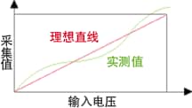 请参照图表。横轴表示输入电压,纵轴表示采集值。直线性表示相对于理想直线,实测值的准确度如何。将(理想值-实测值)中的最大偏移量除以输入范围的值以百分比表示。在实际采集中由于受到环境(干扰、电位差)影响,有可能无法根据分辨率与直线性计算精度。减少这些影响并实现高精度采集的技术有以下2种。
