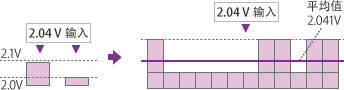 在分辨率为0.1 V的电路输入2.04 V时无法判断是2.0 V还是2.1 V。对此通过过采样实施12次采样,平均下来为2.041 V,从而与输入值相同。