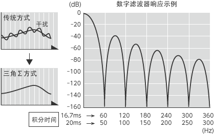 干扰频率在多数情况下与商用电源相同,进行一定时间的简单平均,减少干扰影响。使用时设定为与商用频率相同的积分时间(20 ms:50 Hz区域、16.7 ms:60 Hz区域)。