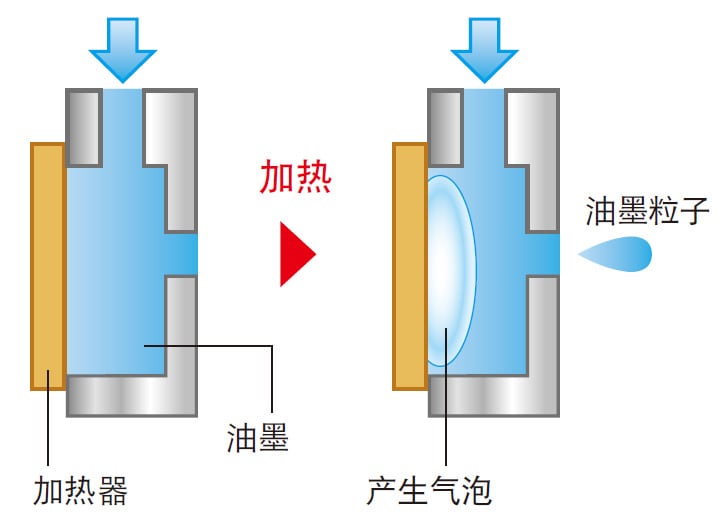 利用加热器加热,使油墨内部产生气泡,然后喷出油墨粒子。