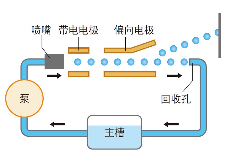 使喷嘴连续喷出的油墨粒子带电,利用偏向电极使油墨偏移,喷到打印面上。