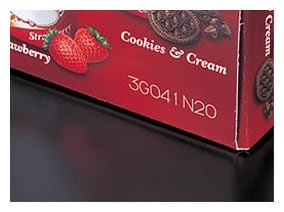 通过对对象物白底面大功率灼烧的方法进行刻印。即使是从打码等其他方式转换而来,也无需进行纸板箱设计变更等工序,可顺利完成替换。