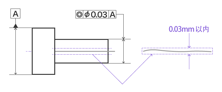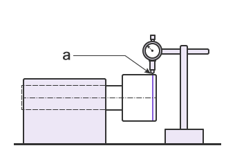 固定目标物,用千分表抵住附带公差标示的轴的外周顶点。旋转测量物,测量千分表跳动的最大示数值与最小示数值。在指定的圆周上进行测量,将其中的最大差值作为同心度。