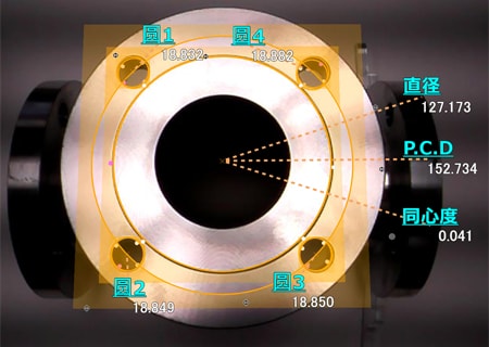 密封面的平面度通过用卷尺、大尺寸游标卡尺测量多个位置来确认。但是采用该方法时,如果未进行测量的位置有尺寸不良,可能会错过不良,不能说是正确无误的检查。而且螺丝孔间距和PCD的测量位置较多,使用手动工具至少需要2人进行长时间作业。